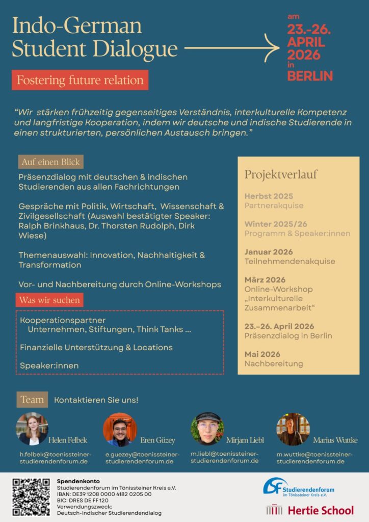 Indien ist ein zunehmend wichtiger wirtschaftlicher, politischer und diplomatischer Partner für Deutschland. Daher haben wir uns entschlossen ein Projekt ins Leben zu rufen, das Interesse, Verständnis sowie Kooperation zwischen beiden Ländern stärkt. Wir wollen eine drei- bis viertägige Studienreise nach Berlin vom 23.04.-26.04.2026 mit je 15 deutschen und indischen Studierenden durchführen. Unsere Zielgruppe sind deutsche Studierenden (SF und andere) sowie indische Studierende, die sich bereits in Deutschland aufhalten